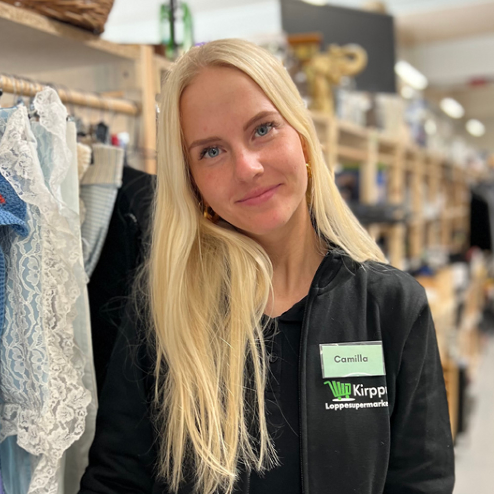 Mit navn er Camilla Jacobsen, og jeg er butikschef i Kirppu Søborg. Jeg glæder mig hver dag over at byde både nye og faste kunder velkommen i vores loppesupermarked.